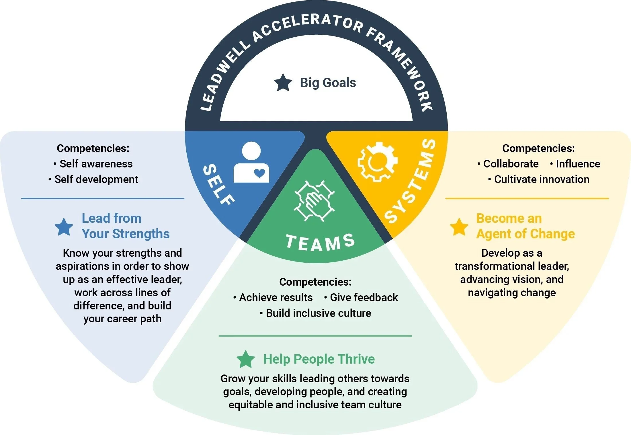 The Leadwell Accelerator is a small investment in people that builds employee engagement, upskills staff, and strengthens culture. The Leadwell Accelerator's comprehensive curriculum offers a 35-hour cohort experience over the course of 6-12 months. Participants join small cohorts with their peers, deepening authentic relationships, building leadership skills, and immediately applying strategies to current problems of practice. Leadwell’s research based curriculum guides participants to: